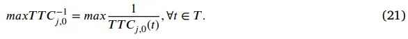 由于当被测自动驾驶汽车的速度等于或小于前一个交通参与者j的速度时,TTC的值无法有效确定,因此通过分析测试过程中的TTC来确定最危险的时刻是具有挑战性的。因此,我们利用最大值TTC-1作为评价指标,可以表示为: