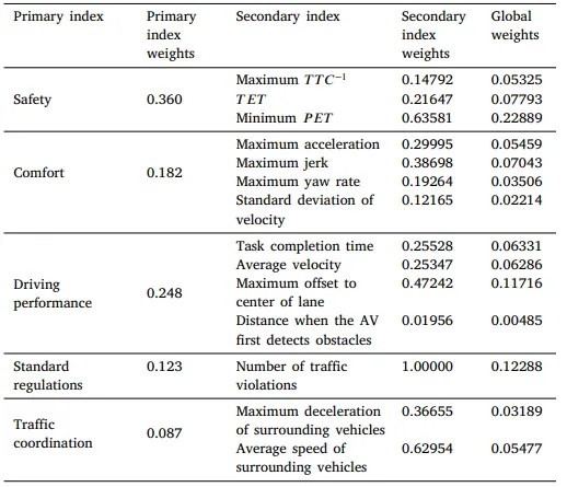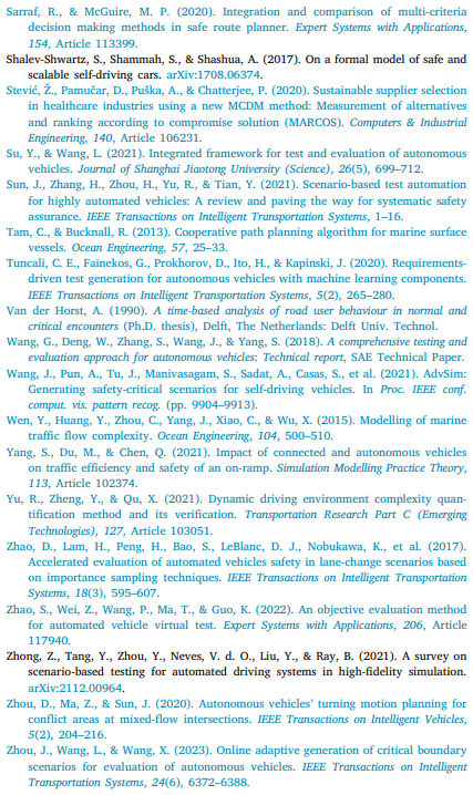 此外,也有一些研究致力于将MCDM方法应用于智能驾驶测试。Wang, Deng, Zhang, Wang, and Yang(2018)使用模糊综合评价(FCE)方法和TOPSIS方法来评估定义任务场景下的自动驾驶汽车。Zhao, Wei, Wang, Ma, and Guo(2022)将AHP法与CRITIC法相结合,计算评价指标的权重。利用自适应灰色关联分析技术生成评价结果。Su和Wang(2021)提出了一种整合顺序关系分析(ORA)方法和FCE方法的ORA-FCE方法来评估自动驾驶汽车的性能。他们采用ORA法确定各指标的权重,采用FCE法确定评价分数。