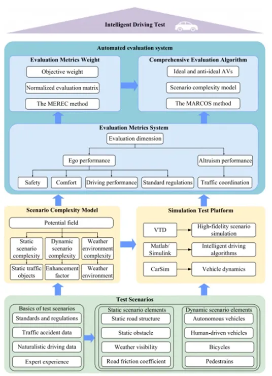 为了实现自动驾驶汽车的自动化评估,增强评估的客观性,本研究提出了自动驾驶汽车自动化评估的四层框架,增强了测试的客观性和可扩展性。首先,我们的框架为全面的自动驾驶汽车测试生成不同复杂度的不同测试场景。其次,我们采用势场法来量化场景复杂性,帮助评估各种驾驶挑战。第三,我们的联合仿真平台结合了VTD、Matlab/Simulink和CarSim,实现了精确的场景仿真和高精度的车辆动力学建模。第四,自动化评估系统采用多维指标和评估算法,减少了人工参与,加快了评估速度。