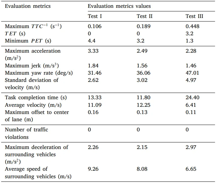 我们在现场实验中获取了实车测试的评价指标值。我们进行了三次真实世界的实验,三个实验的场景复杂度逐渐增加,分别对应图10(b)、(c)和(d)。不同测试中的评估度量值如表7所示。采用OMDCE方法计算被试车辆的评价结果,如表8所示。利用OMDCE方法,得到了被试车辆在不同维度下的测试评价分数,以及考虑不同场景复杂性的综合分数。此外,还可以计算出每次试验中被试车辆的详细评价分数。在表7中,被测车辆在三次测试中均未违反交通规则,因此该项在三次测试中得分均为100分。另外,测试车辆在测试场景III中的PET值最小,而在测试场景III中的TTC-1值和TET值最大,说明测试车辆在该场景下的安全性极差。这些发现反映在表8的结果中。