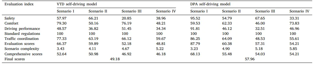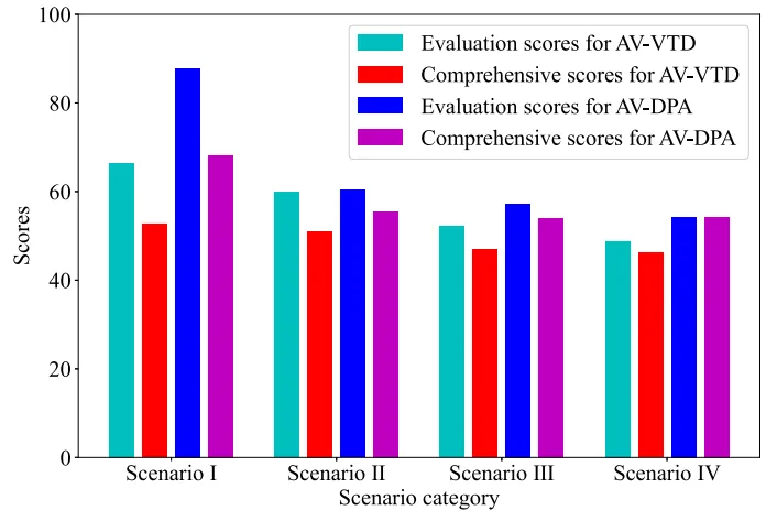 图9. VTD自驾车模型与DPA自驾车模型的评价分数与综合分数比较。