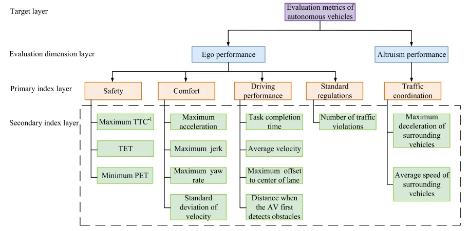 图4. 自动驾驶车辆评价指标体系。提出的评价指标体系包括自我绩效和利他绩效两个维度,可对自动驾驶车辆的多维性能进行综合评价。自我性能主要衡量被测车辆的安全性、舒适性、驾驶性能和标准法规,利他性能主要衡量被测车辆对交通协调的影响。