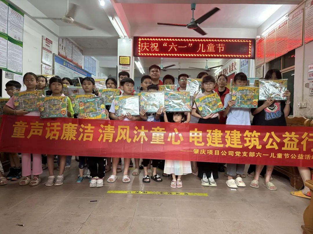 “六一”当天,投资公司肇庆项目公司青年志愿者们前往驻地桥林社区开展”童声话廉洁 清风沐童心“公益活动,为小朋友们送上书籍、文具等节日礼物。活动现场,大朋友、小朋友共同分享廉洁故事,朗诵廉洁诗歌,一起做游戏,度过了一个充实的六一儿童节。