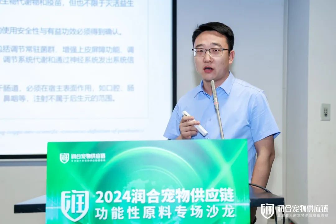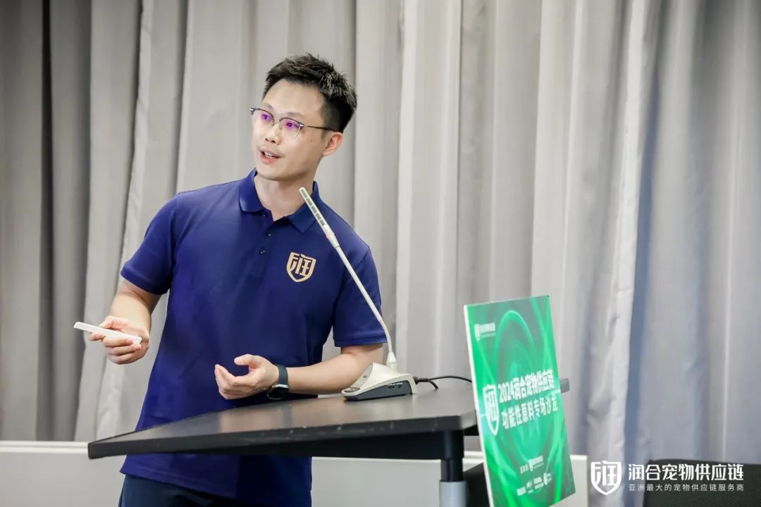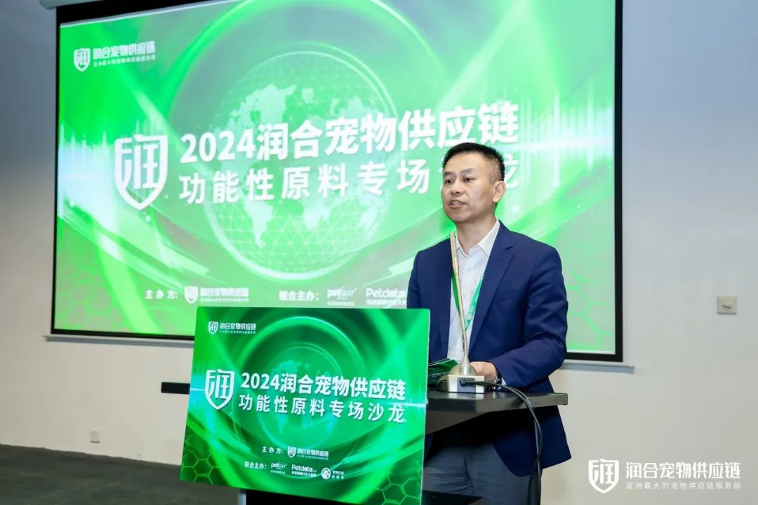 内蒙古科拓微生态科技发展有限公司副总经理黄卫强博士以《后生元在宠物食品中的应用及探讨》为题,首先回顾了全球宠物食品市场的发展历程并介绍了益生菌在宠物食品中的关键作用。随后阐释了后生元作为益生菌的进阶形态,以更高的稳定性和多重健康功效成为了宠物食品领域的重要原料,以及后生元在肠道保护、抑菌、提升免疫力和保肝护肾等方面的主要功能,展示了其在宠物健康中的广泛应用。最后展望了功能性原料在宠物食品中的未来趋势,润合宠物供应链将携手科拓生物继续推动这一领域的发展,为消费者提供更高品质的健康产品。