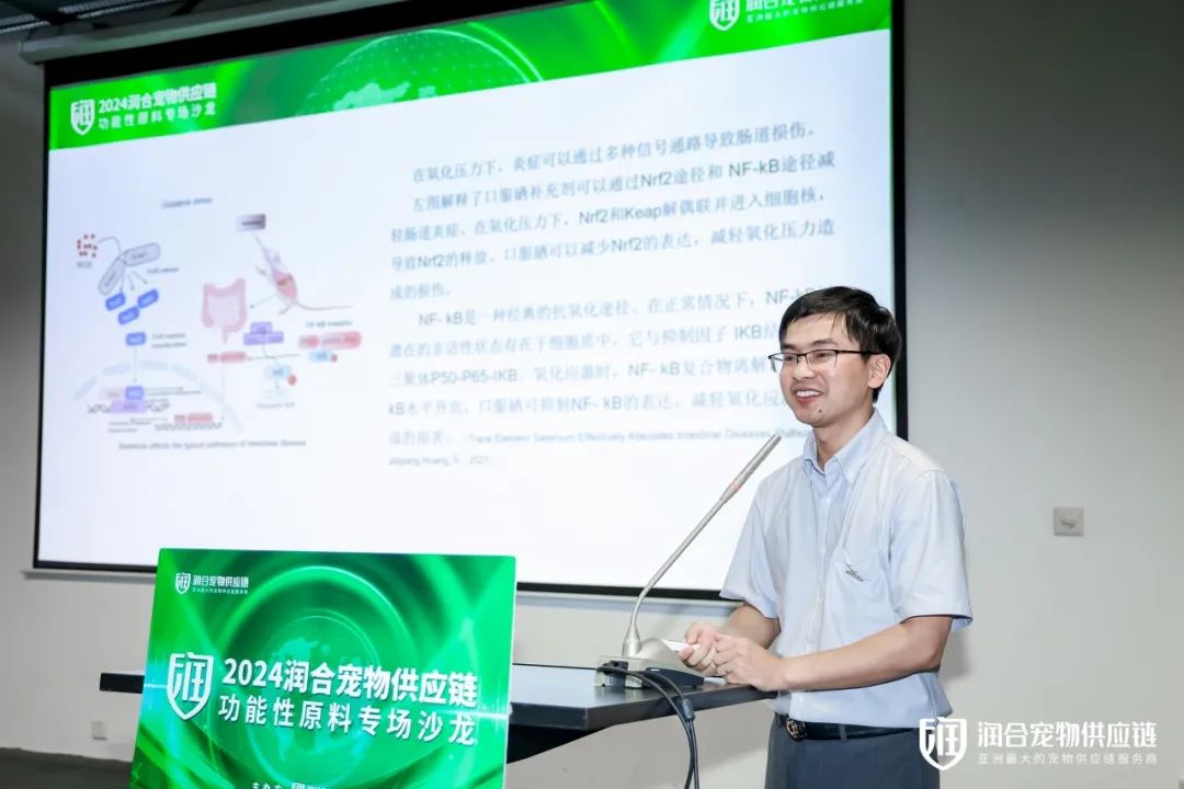 长沙兴嘉生物工程股份有限公司产品总监兼长沙嘉润爱宠生物科技有限公司技术总监王赏初博士以《新型矿物微量元素在食品中的应用及探讨》为题,分享了微量元素在宠物健康中的关键作用,强调微量元素在抗氧化、免疫系统健康等方面维持生物体正常生理功能中的重要性并指出合理评估和选择微量元素对于避免健康问题至关重要。他强调,在宠物食品配方设计中,需关注营养素的均衡与相互影响。才能更好的提升产品的市场竞争力。并详细介绍了在新型矿物微量元素的创新应用,以高品质氨基酸螯合微量元素更高的稳定性和生物学有效性,能够更精准地补充宠物的营养需求,并减少资源浪费。