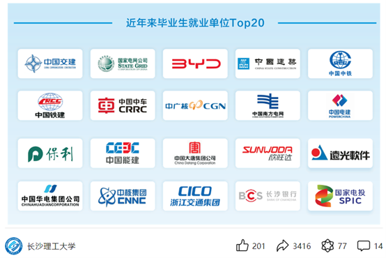 目前,长理已与中国交建、中国铁建、国家电网、中广核等大型国企开办校企联培班,并与湖南省高速公路集团有限公司、张家界市人民政府等单位签订了战略合作协议。这些举措极大地促进了产学研的融合,为长理学子提供了更多实践机会和就业渠道。