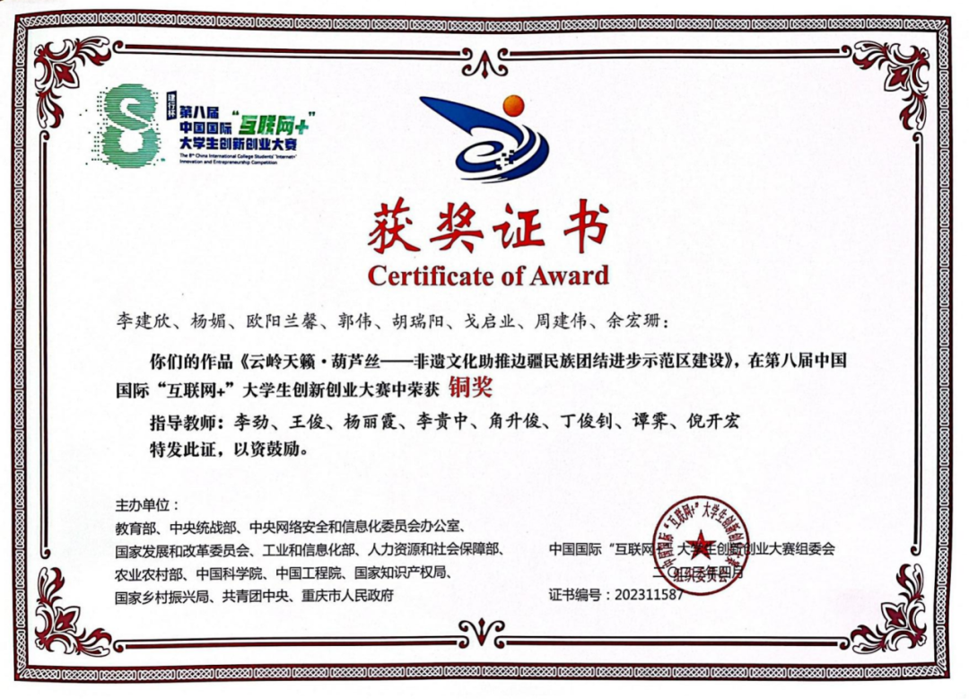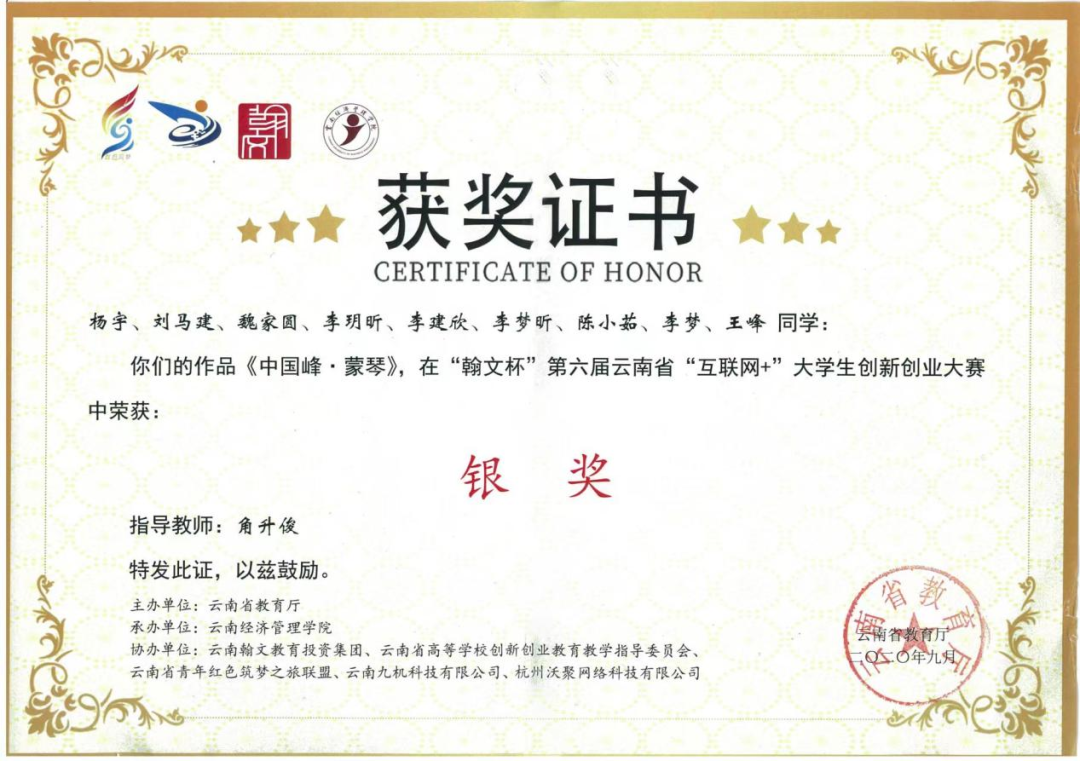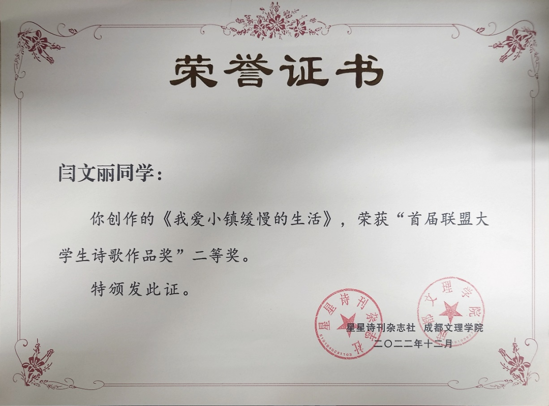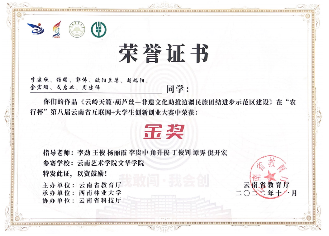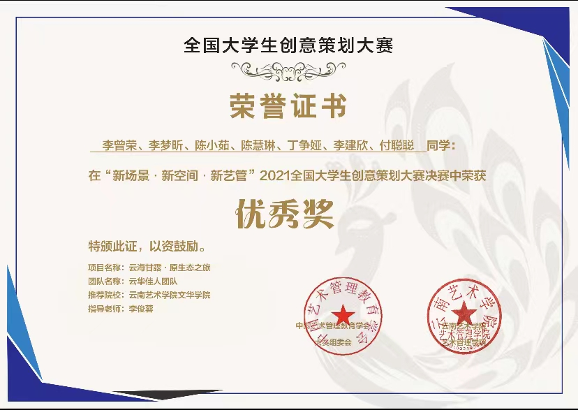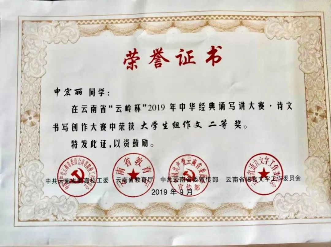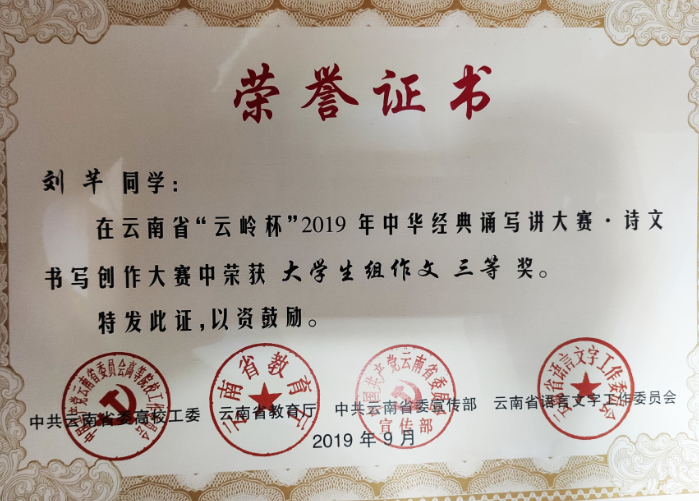 汉语言文学专业学生在校期间,普通话二级甲等通过率达95%,教师资格证通过率达88%。同时多次在国家级、省级、校级比赛中获得优异成绩,2024年2021级刘乐在第五届云南省“百名大学生自强之星”寻访推报工作中荣获云南省“百名大学生自强之星”;2022年度集团高校首届大学生诗歌比赛中,2020级汉语言文学专业的闫文丽、后兵同学荣获“首届联盟大学生诗歌作品奖”二等奖。2022年、2021年2023年“互联网+大学生创新创业大赛”中荣获省级金奖、国家级铜奖;2021年度云南省中国语言文学类专业本科大学生语文课程教学比赛中荣获三等奖和优秀奖;2020年“云岭杯”系列比赛荣获多个奖项;2019在“互联网+大学生创新创业大赛”中荣获省级银奖。