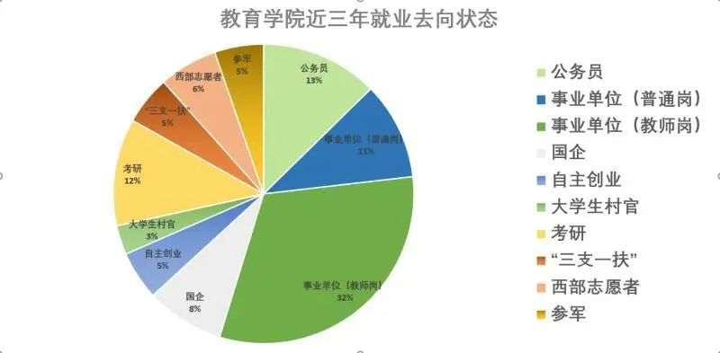 教育学院各类专业学生专业能力、实践能力和创新能力较强,就业方向大多为行政机关、事业单位、国企、私企等其他用人单位,毕业生能力深受用人单位好评。