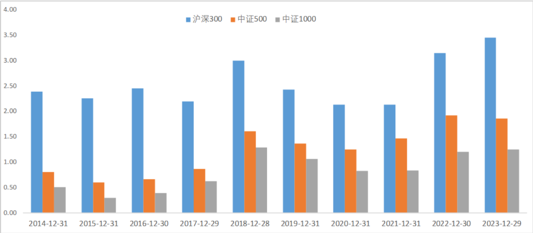 沪深300指数成分股为市值较大,对比其他主流指数来看,沪深300指数的股息率明显高于其他中小盘指数。较高的股息率说明了沪深300指数中的公司经营情况更加稳定。