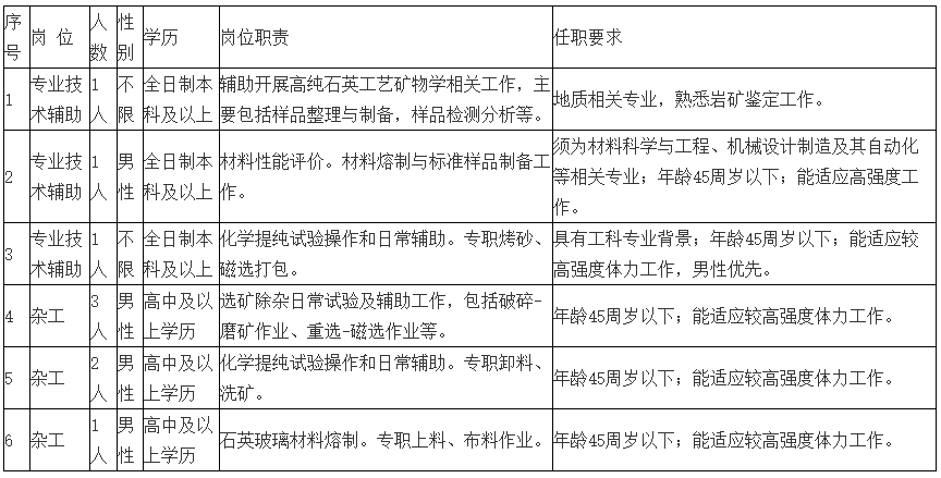 根据工作需要,现拟招聘劳务派遣人员9名,用工单位为中国地质科学院郑州矿产综合利用研究所。该用工单位为中国地质调查局直属科研机构,是国家非金属矿资源综合利用工程技术研究中心依托单位。具体岗位及要求如下。