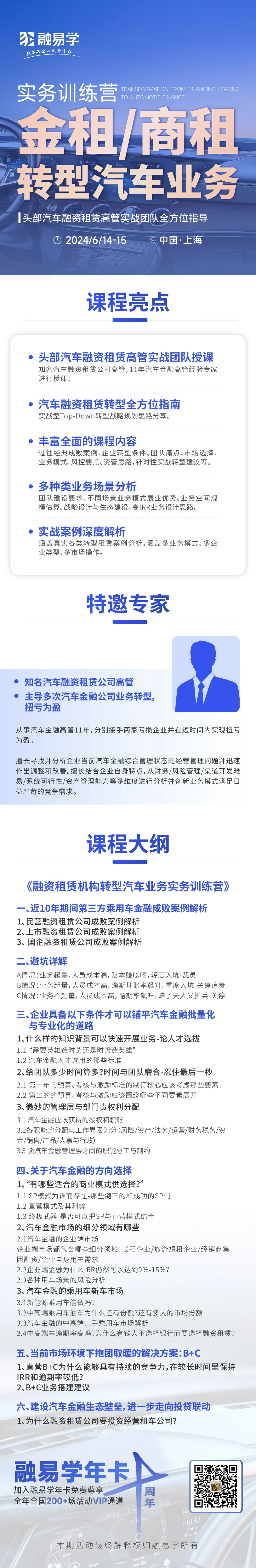金租商租转型汽车大揭秘:近10年成败案例解析!头部汽车融资租赁高管实战团队全方位指导,6月14-15日上海开课。