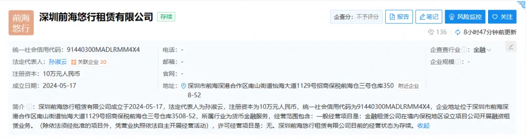 招银金租虽未设立专门的汽车租赁事业部,但官方途径查到,招银金租已成立了多家名为“悠行”的融资租赁公司,法定代表人均为孙淑云,公司注册资本为10万元,近期在深圳又成立一家,主要经营范围为融资租赁业务。该融资租赁项目子公司主要服务于招银金租汽车租赁版块的相关业务。