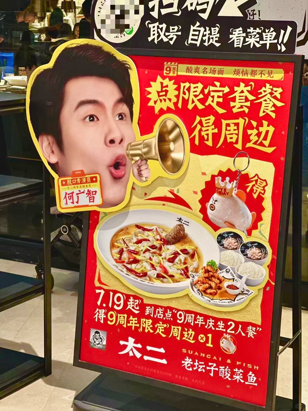 除此之外,太二还在全国五城打造了周年庆主题店,消费者在等菜的时候可以扫码看短剧,在门店也实现了真正的看剧下饭。另外,太二还在全国门店上线 “9周年庆生套餐”,顾客到店品尝指定套餐,就有机会获得限定周边,扩大了整个庆生活动的影响范围,形成线上线下品效闭环,也将酸爽到极致的庆生氛围直接拉满全国。
