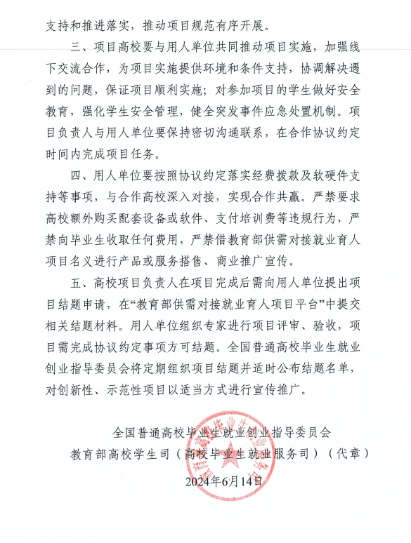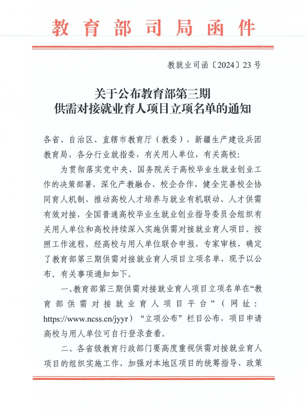 近日,教育部高校学生司印发了《关于公布教育部第三期供需对接就业育人项目立项名单的通知》(教就业司函〔2024〕23号),我校6个就业育人项目入选,其中,就业实习基地项目3个、定向人才培养培训项目2个、人力资源提升项目1个。