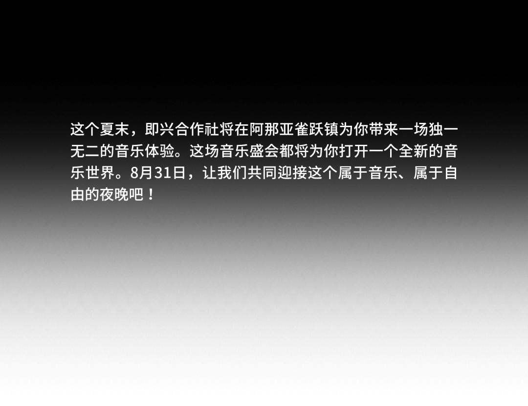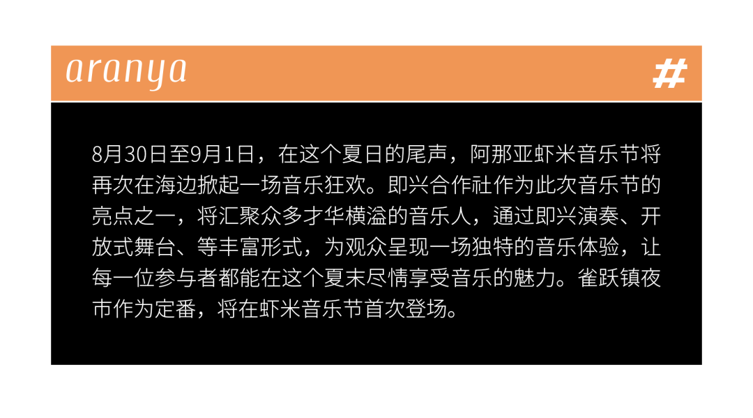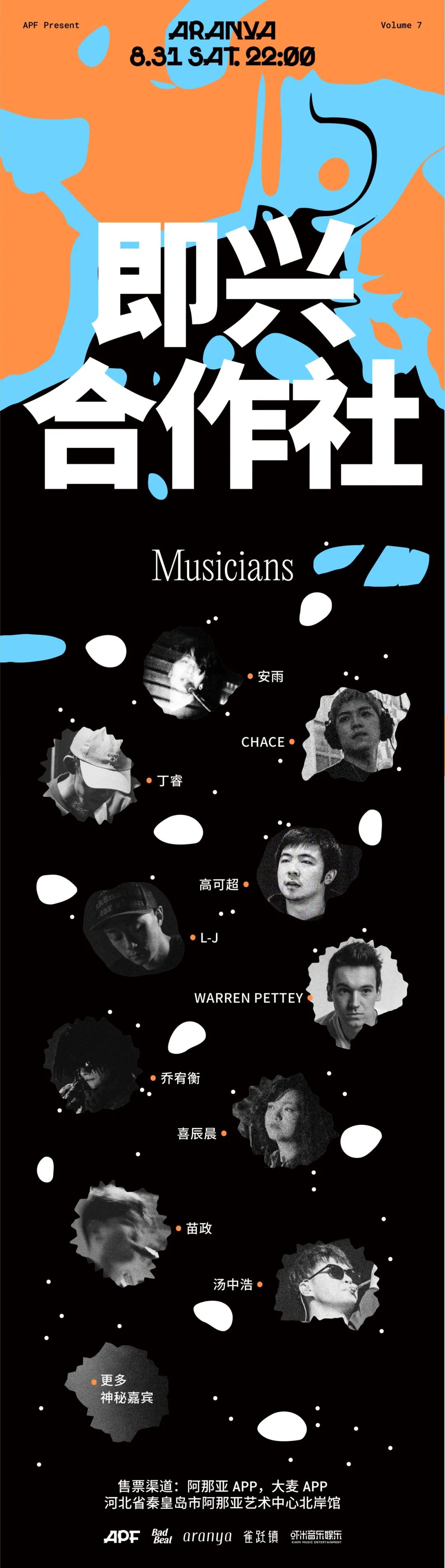 从8月31日晚上22:00开始,大家可以尽情玩乐,嗨到尽兴,阿那亚北岸艺术中心将成为这场即兴音乐盛宴的中心。鼓手安雨、Chace、高可超、丁睿、DJ L-J、键盘手Warren Prettey、小号手汤中浩、萨克斯手苗政、Vocal及合成器手喜辰晨、吉他手乔宥衡等音乐人将带你进入一个即兴音乐的世界。在这里,没有固定的曲目,音乐随情绪与灵感流淌,每一位在场者都将成为这场音乐体验的一部分。