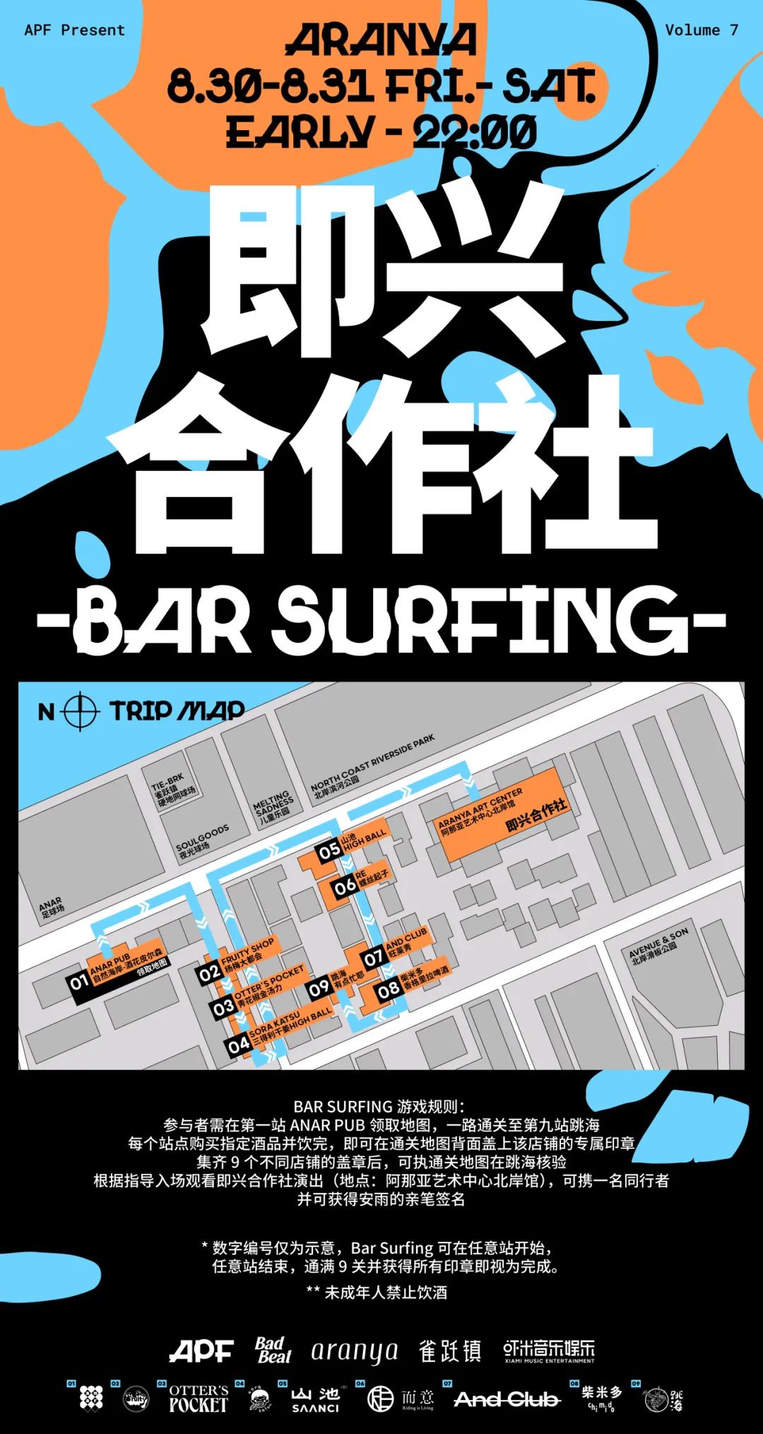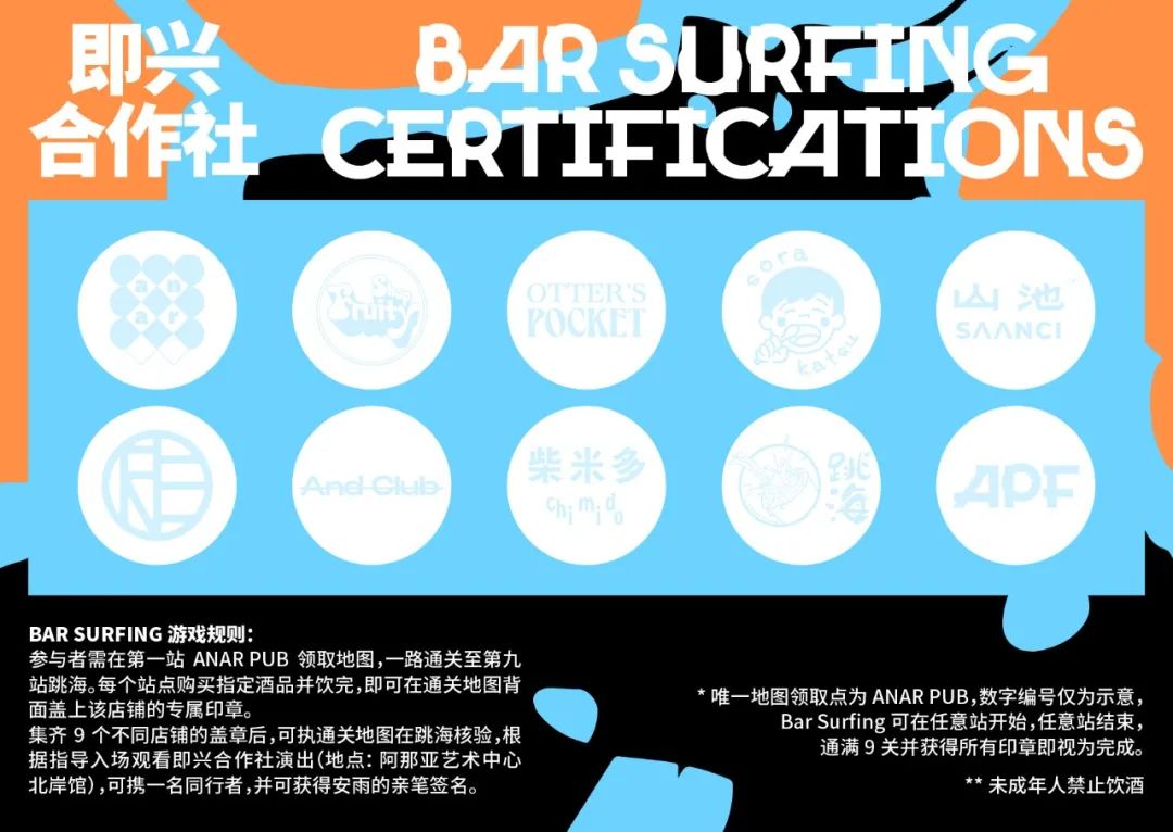当你在雀跃镇流连时,不妨参与Bar Surfing活动,这是一个让你在品味美酒的同时收获惊喜的独特体验,从第一站ANAR PUB领取地图开始,你将踏上一段探索之旅,最终抵达跳海汇合点,每到一个站点购买酒品,便可在地图上盖上该店铺的专属印章。集齐9个不同店铺的印章后,你不仅可以免费入场阿那亚艺术中心北岸馆的现场演出,还可以携一名同行者,并可以获得鼓手安雨的亲笔签名。让这段旅程成为你夜晚最特别的记忆,沿路的每一个停靠点,都是对音乐与生活的礼赞。