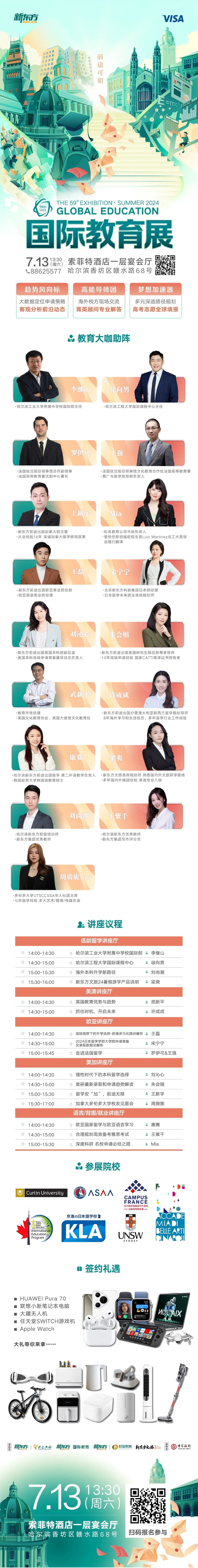 本次教育展基于新东方连续第十年发布趋势洞察报告《中国学生出国留学发展报告》,为参展家长与学子全面解析十年留学精华数据,涉及升学规划、各国申请、录取数据等内容,力求为广大留学家庭及计划留学的学子们提供专业参考。不止于此,截至2024年7月4日,新东方已帮助中国学子斩获QS TOP 200 院校offer 64399枚,且录取数据仍在持续更新中。通过对留学风向的精准把握,以及多年留学精华数据为支撑,帮助学子瞄准留学目标,打造独家留学攻略。此次教育展,新东方前途出国邀请具有丰富指导经验的英国、美国、加拿大、澳新、欧洲、亚洲王牌导师,组成高能导师团。与家长、学子就留学相关问题展开一对一交流,用专业的服务、领先的录取成果击破中国家庭的留学困惑,帮助学子找准留学方向、选定专业,让留学轻松自如。能与海外院校老师、机构官方代表直接对话吗?本次教育展的回答是:可以!新东方特邀海外院校官方代表,美加澳新欧亚院校招生老师来到教育展现场,与参展家长与学子零距离交流,讲解最新院校政策与动向,解答考情与变化,帮助家长和学子打破海内外院校信息差。不用走出国门,也能掌握海外院校的一手官方信息!高考之后怎么规划留学申请?接触国际教育只能去国外吗?面对家长及学子的困惑,在这里你都能找到答案,新东方前途出国致力于帮助学子在国内升学、国外留学、中外合作办学等多个路径中,找到更适合自己的教育模式,用教育激活潜能,借留学开启梦想。时值盛夏,万物繁茂,天气虽酷热,却是万物生长好时节,正如中高考结束的学子、各阶段的应届毕业生们,他们即将在这个夏天迎来人生新的转折点。多规划一条路线,不止是多一份升学的保障,更是为学子多提供一个用教育探索自我、追逐梦想的新方向。新东方30多年来深耕留学,打造优质服务平台,致力于为中国家长和学子提供完备、周到的留学服务,第59届国际教育展将用多年优质服务经验,帮助家长及学子解决留学难题,规划院校及专业方向,让每一个学生带着满意的答案走向广阔未来。无论你是对国际教育还是升学规划有怎样的困惑,相信在这里都能找到你想要的答案。新东方第59届国际教育展哈尔滨站,7月13日13:30只等你来!