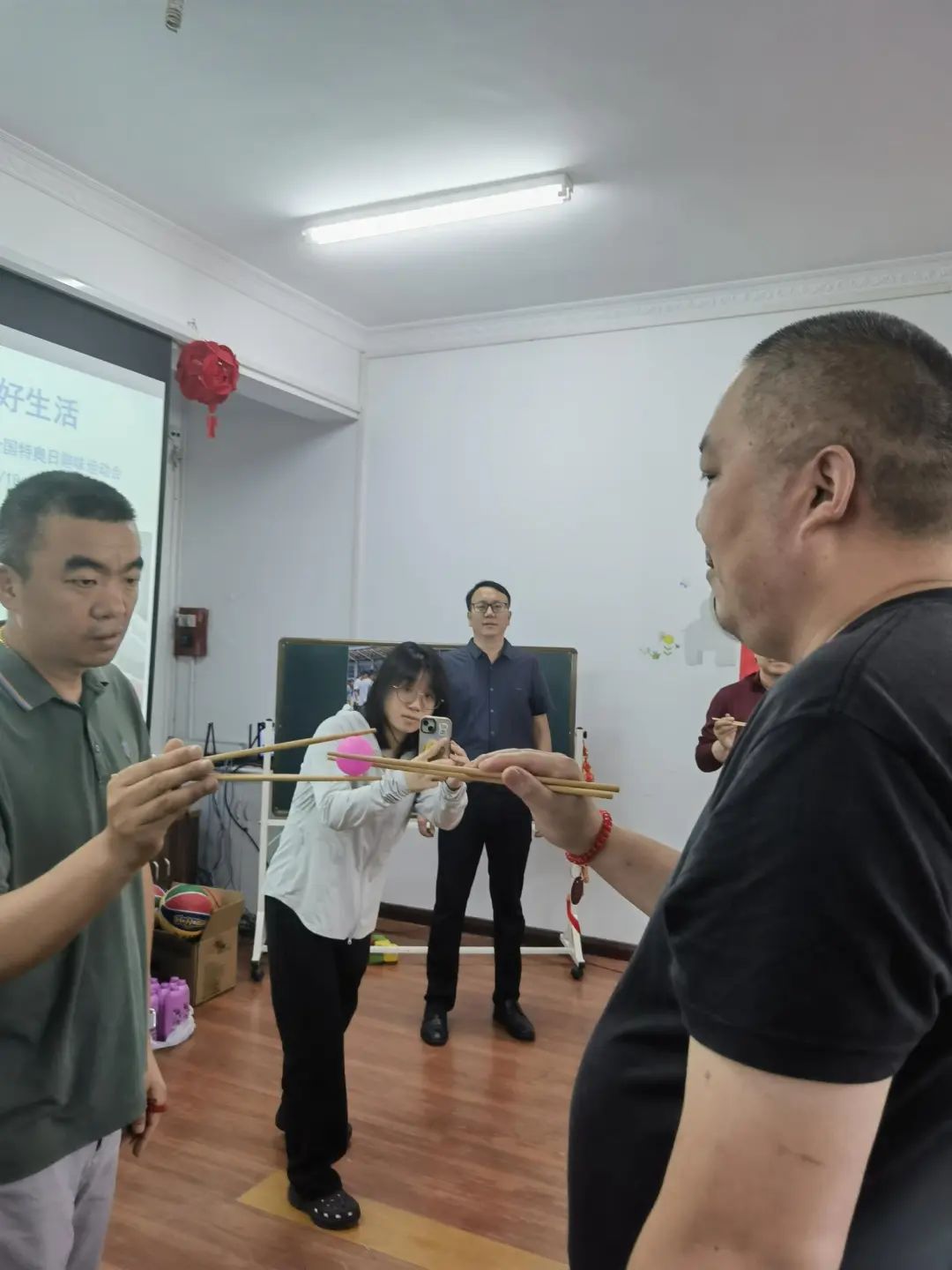 此次趣味运动会共有50名残疾人朋友参加,他们分别参加了单项比赛、团队比赛。单项比赛包括投壶、投飞镖、夹弹珠、投沙包等,团队比赛有“传递满满的爱(筷子夹乒乓球传递)”、“一路球稳(塑料板运球传递)”、“拍三毛球”、“拍篮球”等内容。