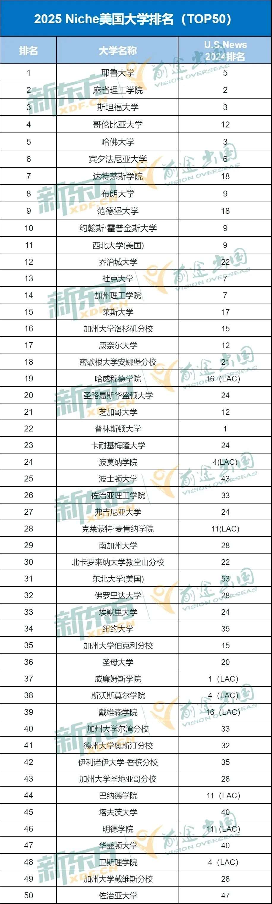 那么,Niche美国大学排名的具体规则又是怎样的呢?在Niche的排名参考指标中,学术实力和性价比占据了相当大的比重。这说明该榜单十分看重大学的教育水准和能否为学生将来的职业发展提供帮助。此外,榜单还综合考虑了教授上课质量、食宿条件、校园活动丰富程度、学生群体多样性、校园及周边安全程度等多个因素。可以说,Niche榜单主打以学生视角出发,严选那些学术实力和教学水准一流,并且在吃住玩乐和安全等方面都表现不错的美国大学。在今年美国大学榜单中,耶鲁大学再次强势登顶!麻省理工学院相较去年上升1位,排在第2名!斯坦福大学排名一直发挥稳定,今年排在第3名;哈佛大学排名从去年的第4名下跌到第5名。公立大学方面,加州大学洛杉矶分校异军突起,荣登“第一公立”宝座,展现了公立教育的卓越实力。而文理学院则以其独特的学术氛围和高质量教育持续受到认可,哈威穆德学院稳居榜首,同时巴布森学院因其在商科领域的卓越表现也备受关注,成为众多学子心中的理想选择。位列TOP30的文理学院分别是:在本次排名中,全美TOP10中最亮眼的有四所大学实现“成功晋级”哥伦比亚大学从去年的第6名上升至第4名,成功跻身前五;