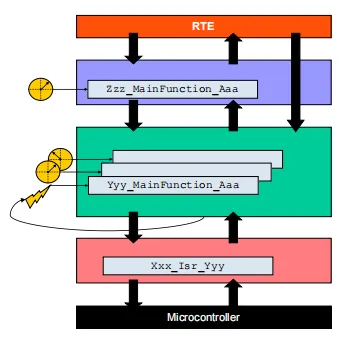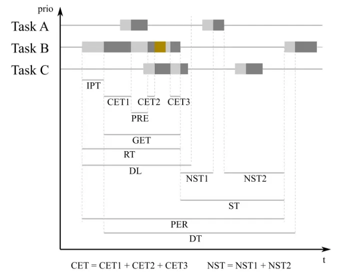 过了发送的三层,才能到接收方,当然接收方也是一样的有这三层。这里不重新说了。可以总结为下图。因为最下层的Propagation time 实际上是完全硬件决定的,我们哪这个时候的时间,作为一个参考值。分别向上进行分析发送的时间和接收的时间。由实时调度器引起的延迟。它描述了在CAN控制器的消息内存中接收到消息到软件中的回调之间的时间跨度。在理想情况下,该延迟的最大值等于接收任务的周期加上在调用回调时发生的软件延迟。但是在实时操作系统里面整个数值是有可能大有可能小的,这主要还是要看优先级以及抢占机制是如何设计的。需要满足任务的特性。比如之前聊到的调度表以及ALARM, 还有各种抢占机制。读取是在读取时钟值时的延迟。它是从调用读取函数和实际读取时间戳之间的时间跨度。这个值不能被假定为常数,因为它取决于软件的实际执行时间。如下图,具体可以阅读之前的深度分析autosar os 时间这篇文章。ΔCtr, Δtrans_Tx, Δtrans_Rx