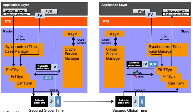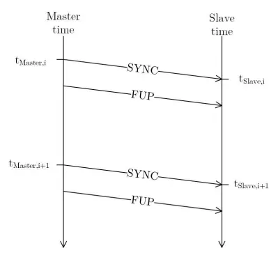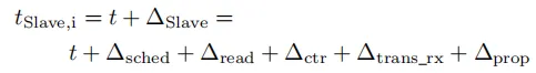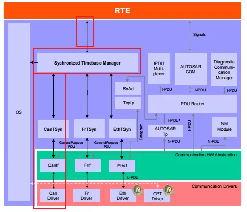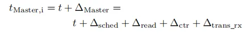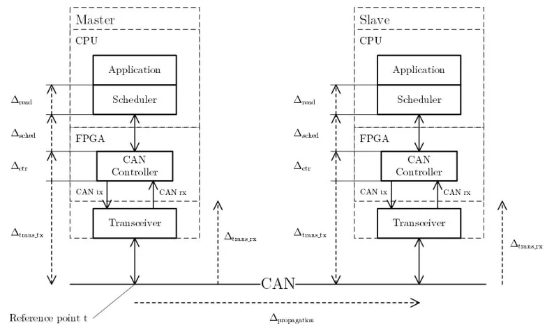 尽管当前汽车工具以太网越来越重要,gPTP 也越来越广泛使用。但是车上仍然有很多CAN/CANFD (下面都用CAN 表示) 的控制器。车上现在的传感器,执行器,底盘上的ABS, 制动,动力系统等等 都还是使用CAN。这些对实时性,可靠性要求较高的控制器,依然保持着CAN 的使用。但是他们的时间信息也需要与整车进行统一。所以这里就带来了CAN 节点也需要做时间同步。相对于ETH 下有传统互联网的加持,PTP 协议 TSN 等等对时都很成熟,对于汽车上面也衍生出了gPTP. 但是受制于CAN 本身的字节数和硬件的影响。这里我们需要思考一套简洁的对时方案。下面我们逐步分析。为了抓住从最根本的原理,我们这里只从本地时间来进行介绍。不考虑外部的时间比如GPS, 等等。理论来说整车上几十上百个控制器的时间信息应该是在同一时刻是一样的。但是实际上是有点偏差的。比如每一个控制器都有一点点偏差,衡量分布式系统同步质量的一个指标是精度。它表示系统中时钟之间的最大偏差,可以定义为在汽车autosar 体系定义中,CANTsyn 同步着不同的控制器单元。这里只是定义了Master 节点给Slave 节点发送两帧报文对比PTP, gPTP 来说,这个是比较简单的协议,而且是单向的。由于硬件和字节长度的限制,报文内部包含的时间信息,是由软件应用层逻辑打进去的。所以这存在一定误差,我们后面一步一步讨论,如何消除掉这些误差。上图显示了(简化的)消息交换。Master向Salve发送一条同步消息。此消息在tMasteri发送时,在tSlavei接收时有时间戳。随后使用FUL消息传输主时间戳。这两个时间戳现在可以用于同步。这便是autosar 定义的CANTsyn. 下面那我们从系统的角度去说一下整个过程。我们指导我们Autosar 软件发送报文,和接受报文的过程其实是个很长的过程。其中可以分为三个层级。CAN 报文发送函数,从函数的角度(CPU执行的角度)放到了发送buffer 就结束了