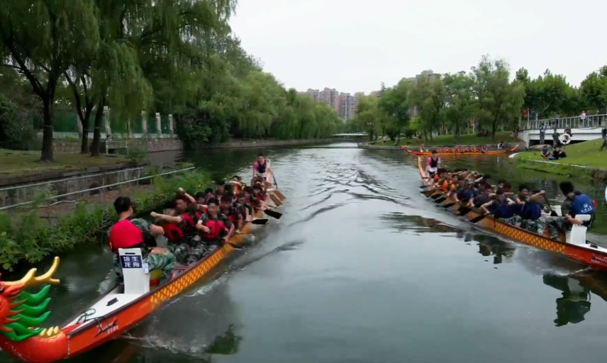 同学们先在陆地上,通过划船机等器械增强自身水平,然后再到学校内的同心河里赛龙舟。