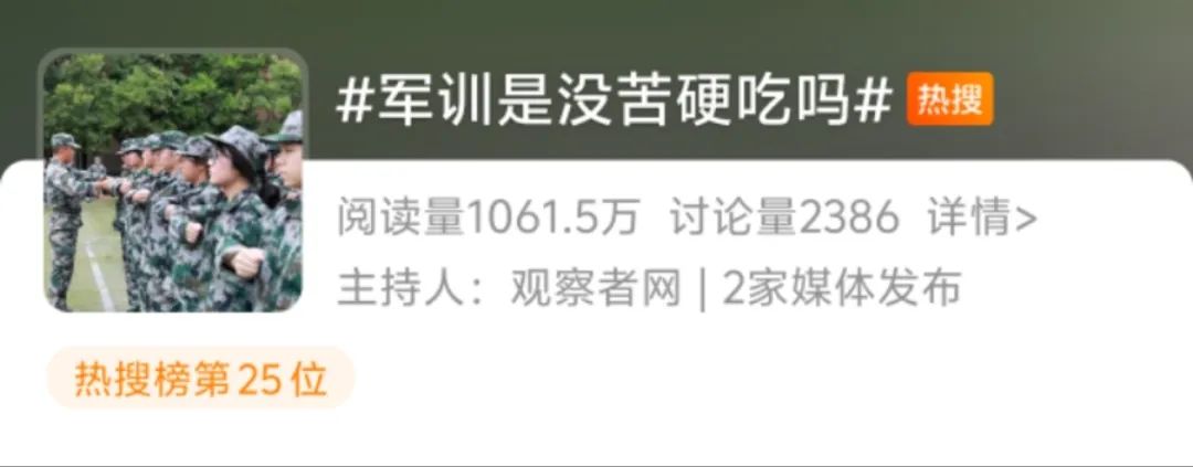 九月,各大高校陆续开学,“军训是没苦硬吃吗”的话题也随之冲上了热搜。