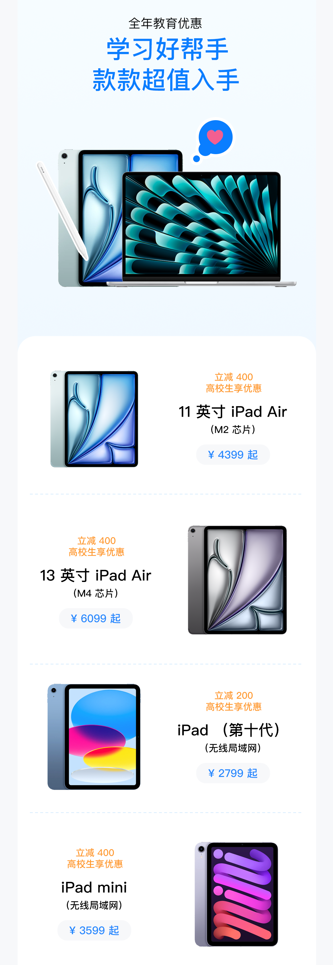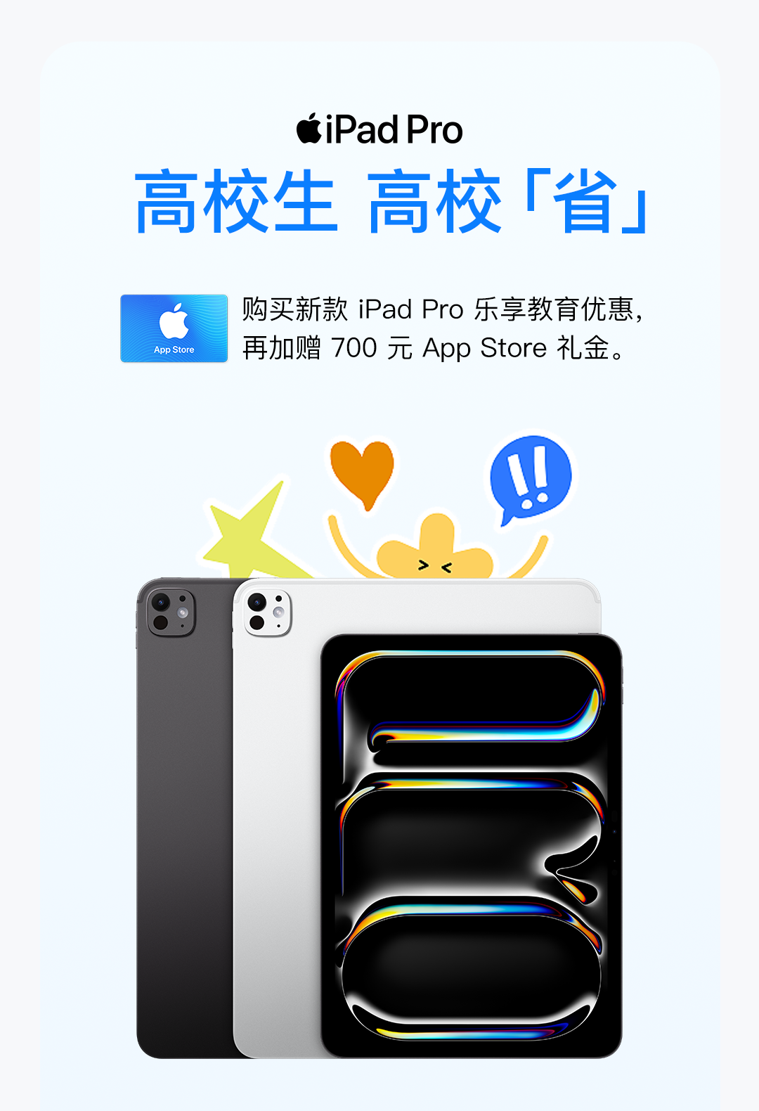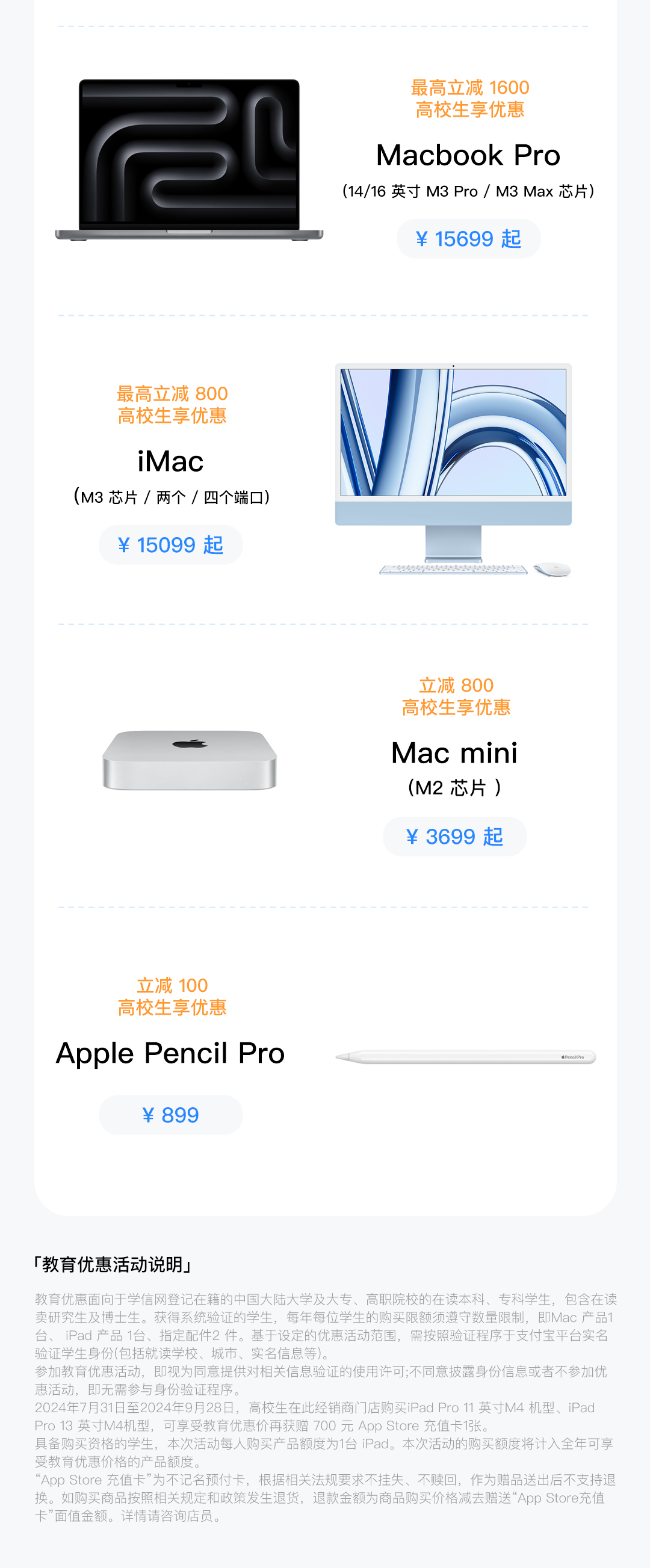 高校生购买 iPad 享教育优惠再赠 700 元礼金卡,购买 Mac 最高再省 1600 元。