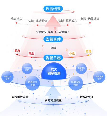 360流量智能体基于高性能底层捕获高速流量数据,首先,六大类威胁检测引擎有效预警海量告警日志,降噪模型聚合事件详情,初步降噪归并为可分析研判的告警事件;其次,以内置的13种攻击确认模型对全量事件进行二次降噪研判,明确事件攻击结果;最终,通过攻击结果提取用户所需关注事件,日志降噪比达到99%。