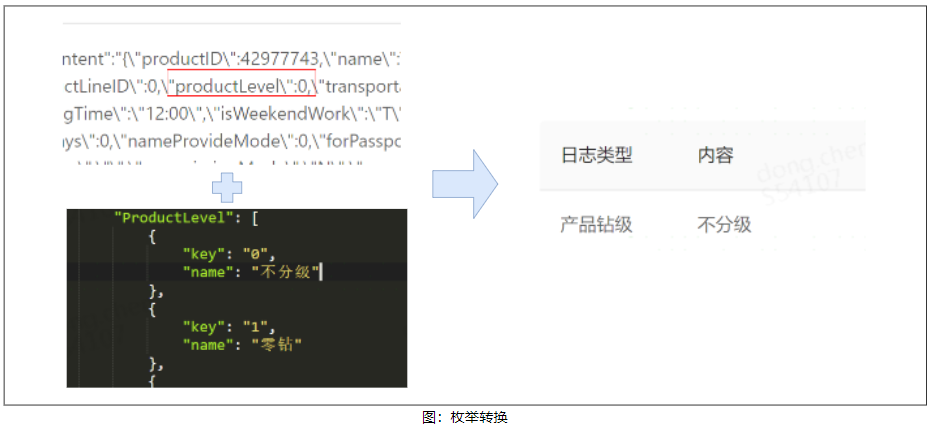 3)枚举类:此类日志内容记录的是一个 key 值,实际用户能理解的是该 key 值所代表的含义,例如产品钻级:0,就需要转换为:“不分级”,这就需要关联枚举值的配置文件进行查询转换。