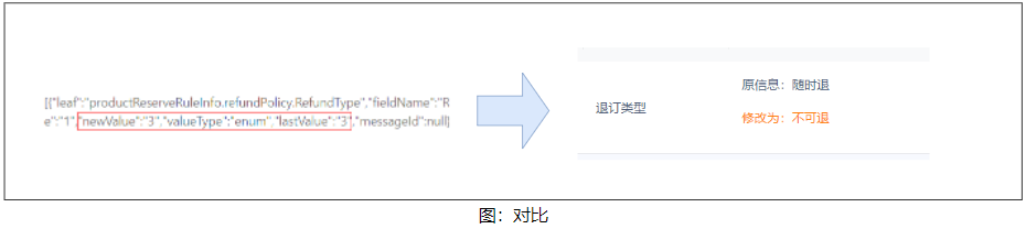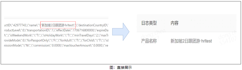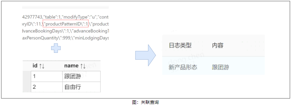 2)数据关联类:此类日志内容中记录的是一个 id,但实际内容存在于另一个关联表的数据中,例如 id:1 表示的是跟团游,不能将 id:1 的日志展示给用户,而需转换为“跟团游”,这就需要进行一步关联 db 表的查询转换。