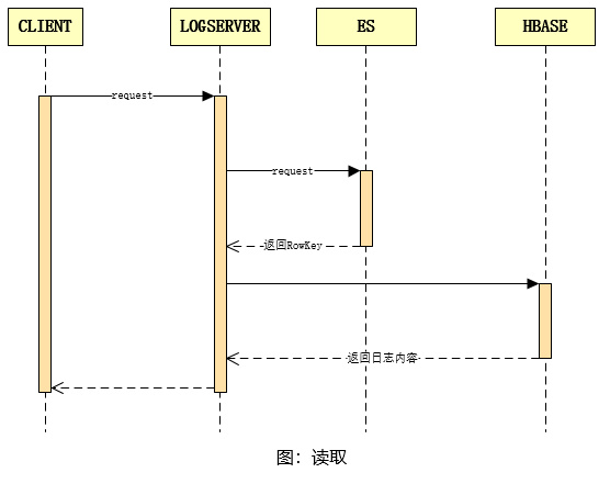 日志的查询流程如上图所示:客户端调用查询 API 并传入查询参数,日志服务接收到请求参数后,将其转换为 ES 分页查询请求,从 ES 集群中查出 RowKey,再汇总 RowKey 并从 HBase 中批量查出日志全文内容。