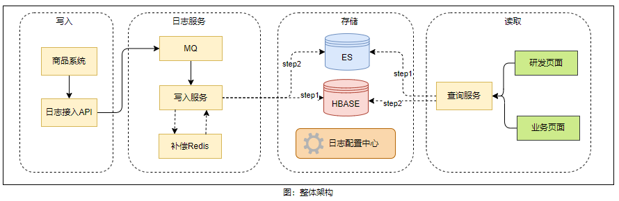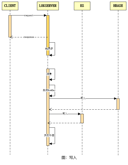 日志的写入流程如上图所示,客户端调用日志 API 以进行数据变动日志的写入操作。日志服务在接收到请求后,将其抛入 MQ,由后续的消费组进行消费处理。消费组件在接收到消息后,会进行相应的消费处理,并根据上述的RowKey生成策略为该条日志生成 RowKey,随后将日志文本内容写入 HBase,在写入成功之后,再将索引数据写入到 ES。其中,若 HBase 或 ES 中的任何一个写入失败,都会将此条日志写入补偿 redis 集群,再由补偿逻辑进行后续补偿,以确保整个日志的写入成功。