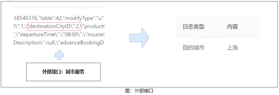 6)外部接口:此类日志记录的是一种依赖外部接口的值,例如日志记录的是城市 id:2,代表的是上海,这就需要调用外部接口将 2 转换为上海。
