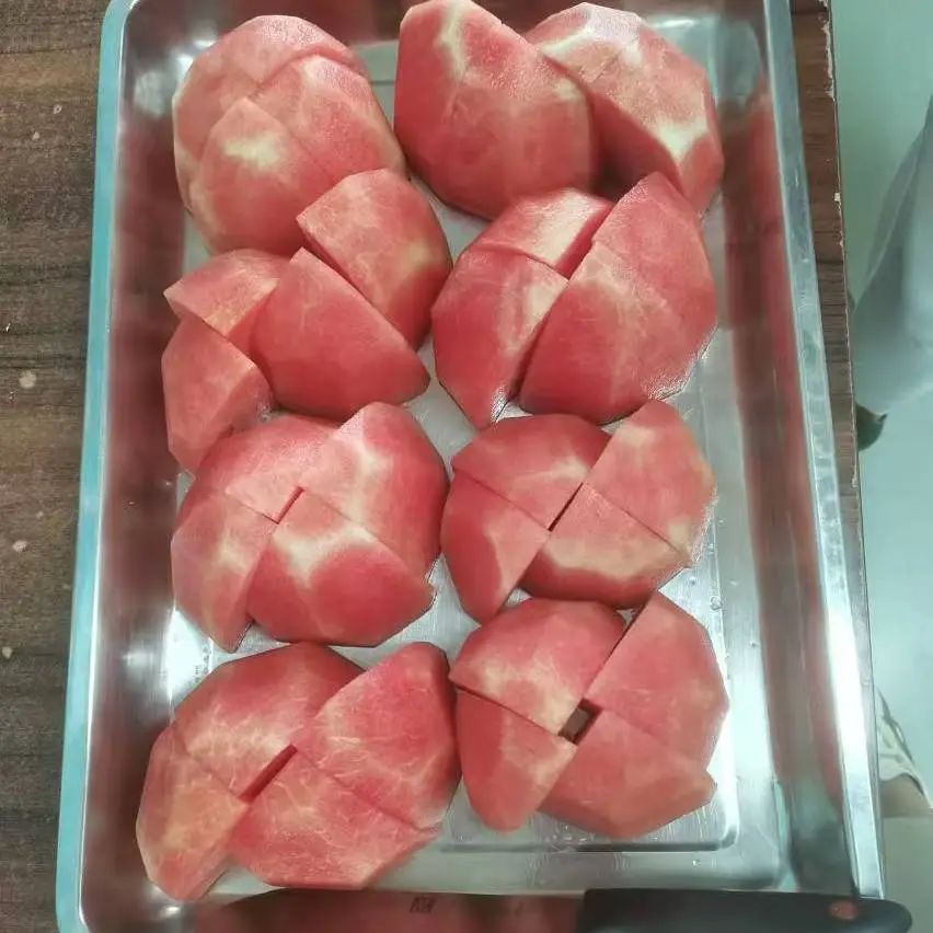 “咔、咔、咔”,切西瓜时发出的脆响是最诱人的。我看着眼前红彤彤的无籽西瓜,嘴中早已水津津的了。刚咬下去的第一口,浓厚的果味就瞬间在口中“爆炸”开来。清凉的果肉一口接一口,实在停不下来,太诱人了,太美味了!我一边享受着西瓜带来的欢乐,一边向这些努力搬运的师傅致谢。