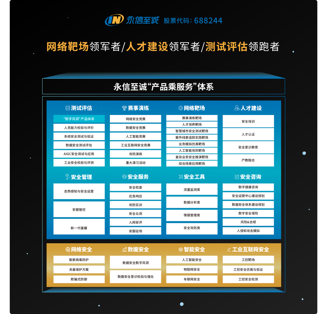 作为数字安全测试评估赛道领跑者、网络靶场和人才建设领军者,永信至诚持续发挥优势,为各行业领域提供专业的测试评估保障及专有人才支撑,助力数字中国和网络强国建设,保障数字健康,带给世界安全感。