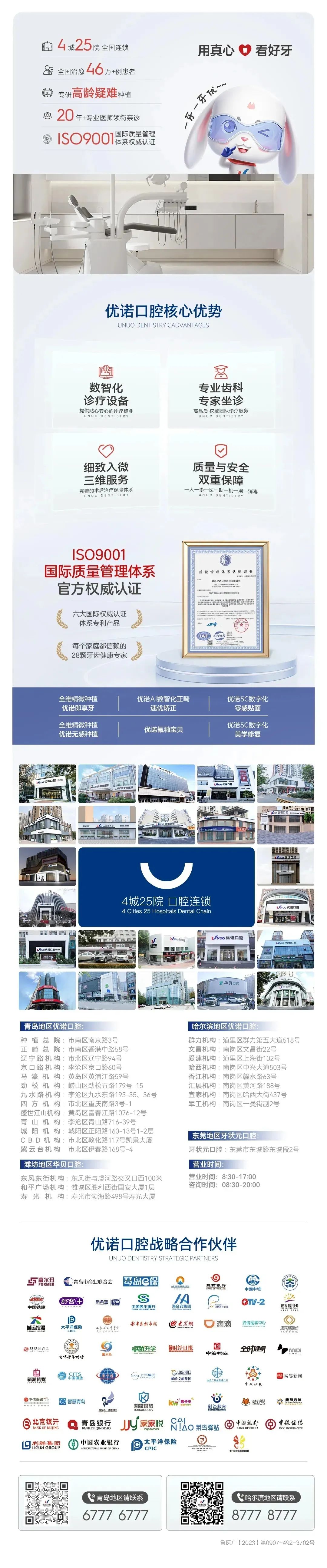 为提高青少年儿童口腔服务能力,2024年6月,优诺口腔(青岛)正畸总院在市南区香港中路58号启用。2024年8月,优诺口腔(哈尔滨)哈西机构全面升级为全国正畸旗舰店。