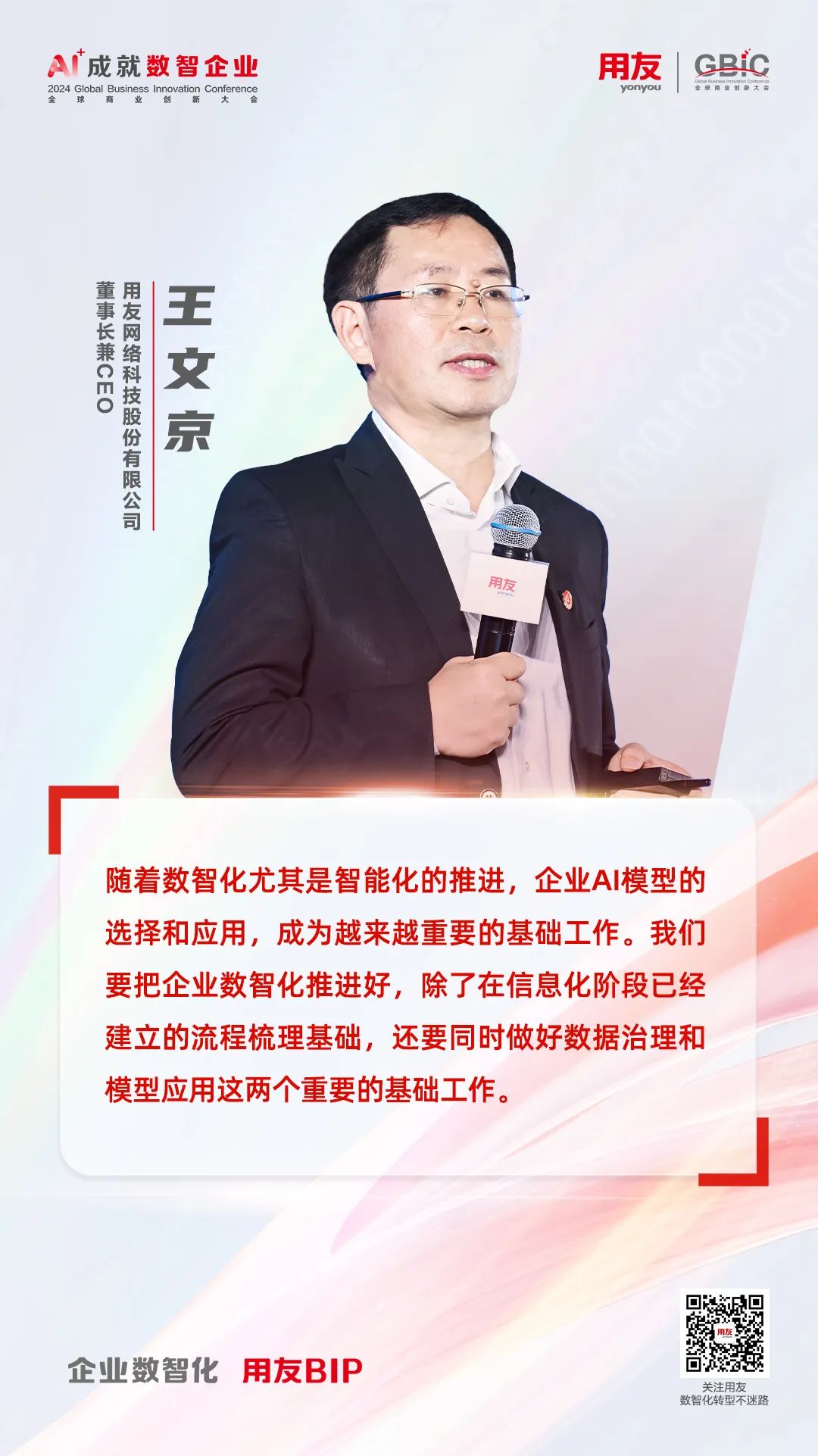8月10日,由用友主办的“2024全球商业创新大会”在北京隆重召开。会上,用友网络董事长兼CEO王文京发表题为《AI+成就数智企业》的精彩分享,指出人工智能(AI)技术的迅猛发展已驱动AI在企业的应用进入普及化阶段,大大加速了数智化的进程,企业数智化由此前侧重数字化,进入到数字化和智能化并举的新阶段。用友BIP智能和数据能力再升级,助力企业加速推进数智化,发展新质生产力,迈向高质量发展。