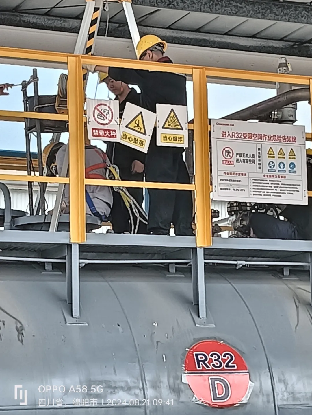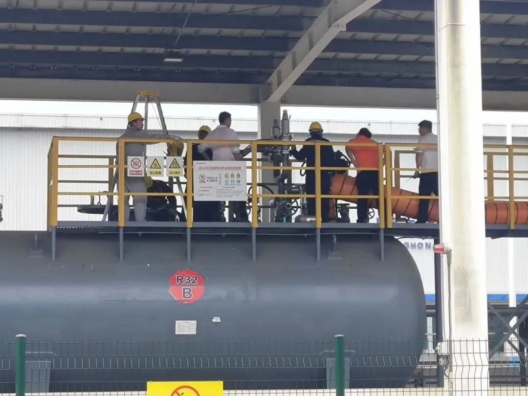 “冷媒站R32储罐自2019年投入使用以来,此次为盛装冷媒后首次进罐作业,罐内易燃易爆气体集聚及窒息环境,进罐作业涉及动火、有限空间等多项特殊作业。”长虹能源动力中心相关负责人介绍道,为确保完成此次检验工作,制定了《R32罐区储罐定期检验实施方案》,从组织安排、技术要求、临时保产、应急预案等方面全方位谋篇布局。