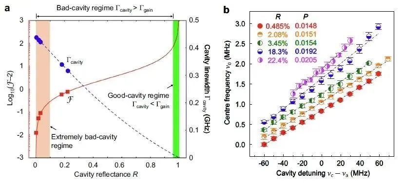 在这项研究中,激光器腔精度接近于最低极限值2。利用如此低精细的谐振腔实现激光,并研究其物理原理和机制,证明其在量子精度测量中的独特优势,之前从未被报道过。该工作利用7.17 MHz的增益线宽,实现了1.2 kHz的窄线宽激光输出,实现了优于原子跃迁自然线宽3个量级的线宽压窄效果。实验上得到腔牵引系数为0.0148,是目前连续波主动光钟激光器的最低值。极坏腔激光的新概念不同于传统激光,这一研究成果为实现主动光钟超窄线宽激光提供了新的技术途径,有望开启量子物理的一个全新研究领域。