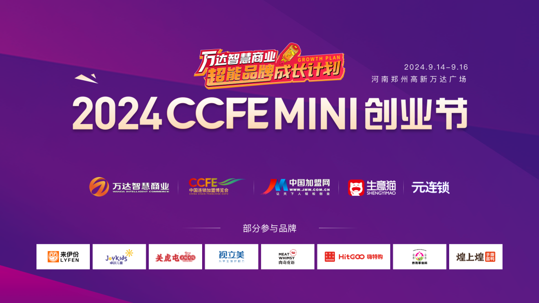 9月14日-16日,由万达智慧商业平台与CCFE中国连锁加盟博览会及中国加盟网共同打造“超能品牌成长计划“专场——CCFE郑州MINI创业节,将在郑州高新万达广场举办。