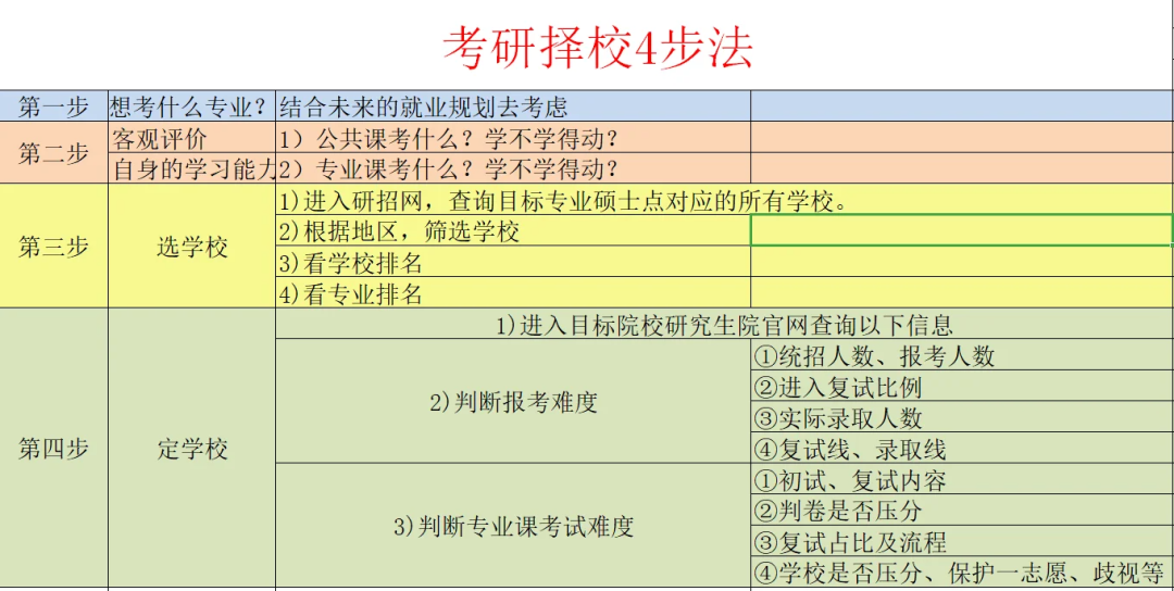 今天为大家整理好了备考期间的26考研现在就该了解院校专业啦!还没有确定学校的同学,请务必记住考研择校4步法!!可以是自己本科的专业,也可以是别的专业,跨考。专业的选择建议大家一定要从未来的就业规划角度去考虑这个问题。第2步,我们要客观的评价一下自己的学习能力,扪心自问,这个专业你能考吗?想考是一回事,有没有能力考又是另一回事。需要明确考试科目有哪些?有没有你的短板和盲区?这直接关系到你考上的几率到底有多大?