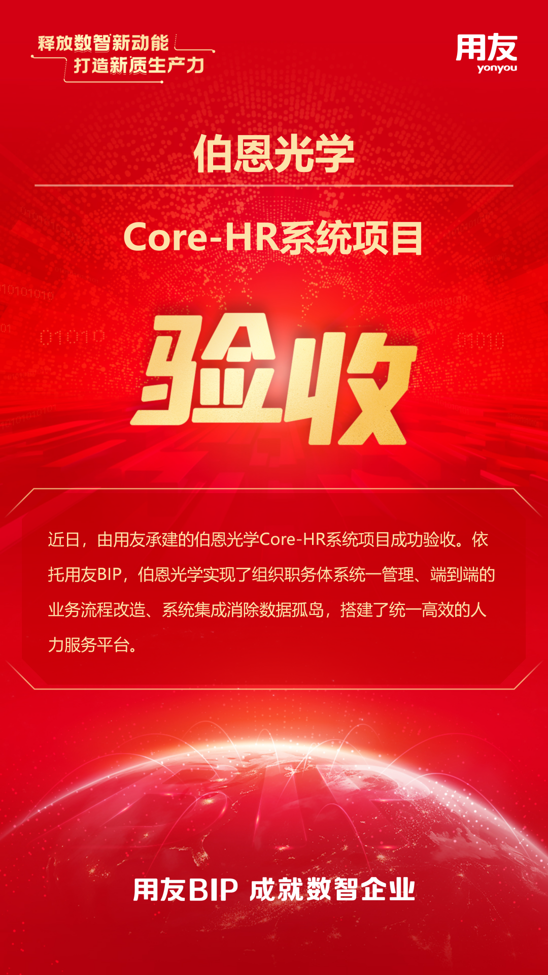 近日,由用友承建的伯恩光学Core-HR系统项目成功验收。此次合作,依托用友BIP,伯恩光学实现了组织职务体系统一管理、端到端的业务流程改造、系统集成消除数据孤岛,搭建了统一高效的人力服务平台。