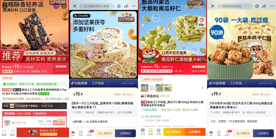 按照心智属性及产品工艺初步分类,松鼠给“坚果+”产品做了品类界定,主要分为坚果糕点,比如坚果棒、坚果酥、坚果糕,还有坚果饼膨类,坚果巧克力类,以及坚果粉粉类,坚果酱类,冻干坚果&果蔬脆。在上一个销售周期中,松鼠在“坚果+”做了几款新品尝试,包括坚果八珍糕、黑芝麻核桃软糕,以及巴旦木瓜子仁酥。其中黑芝麻核桃软糕在近几天的日销也已经接近10万。对于品类端口而言,这款产品的增长是超出预期的,这也体现了“坚果+”产品的销售潜力。