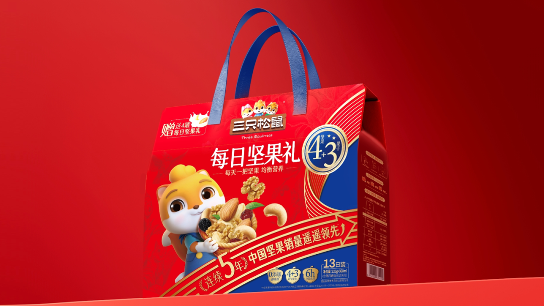 除了按照人群划分,松鼠的每日坚果还在向膳食线和礼赠线方向发展。一方面拓展“每日坚果+N品类”的新组合,融入果蔬、肉制品、冻干、谷物脆等健康食材,开发新客群。另一方面,每日坚果作为少数兼具休闲属性和健康属性的零食品类,亦是节庆送礼的最佳选择之一。所以,松鼠规划将量贩箱装结构化升级为礼赠装,把每日坚果的礼赠化场景放大,能够取代部分消费者对烘焙、八宝粥、燕麦等送礼单品的需求。