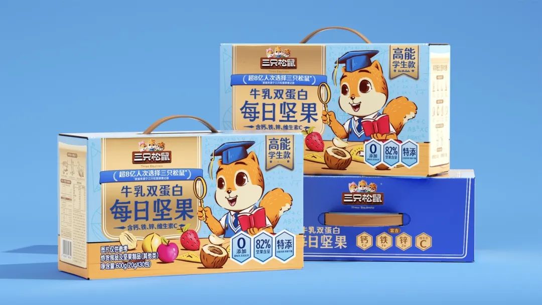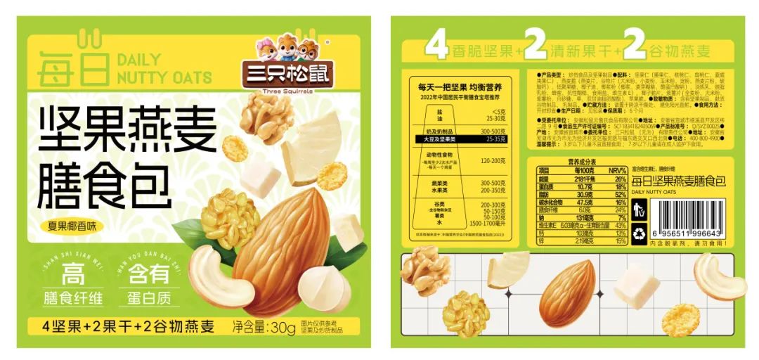 我们可以发现,目前市场上常见的每日坚果,基本都采用30个独立小包装的箱装售卖方式,产品也都基于全坚果,或是“果干+坚果”混合包装的两种形式推出。此前,松鼠上新不同款的每日坚果,也未曾改变坚果+传统果干的“标配”,只是机械式的调整着“几加几”的原料配比,或是在果仁中添加一些营养元素。
