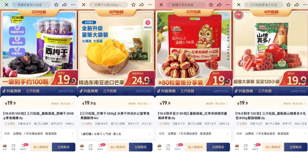 在上一个销售周期中,松鼠的果干蜜饯品类实现了高速增长,同比增长达191%。通过复盘,品类端口总结出核心策略,即“抓大放小”,通过适配渠道销售,将各子品类产品线中的经典大单品重新“复活”。