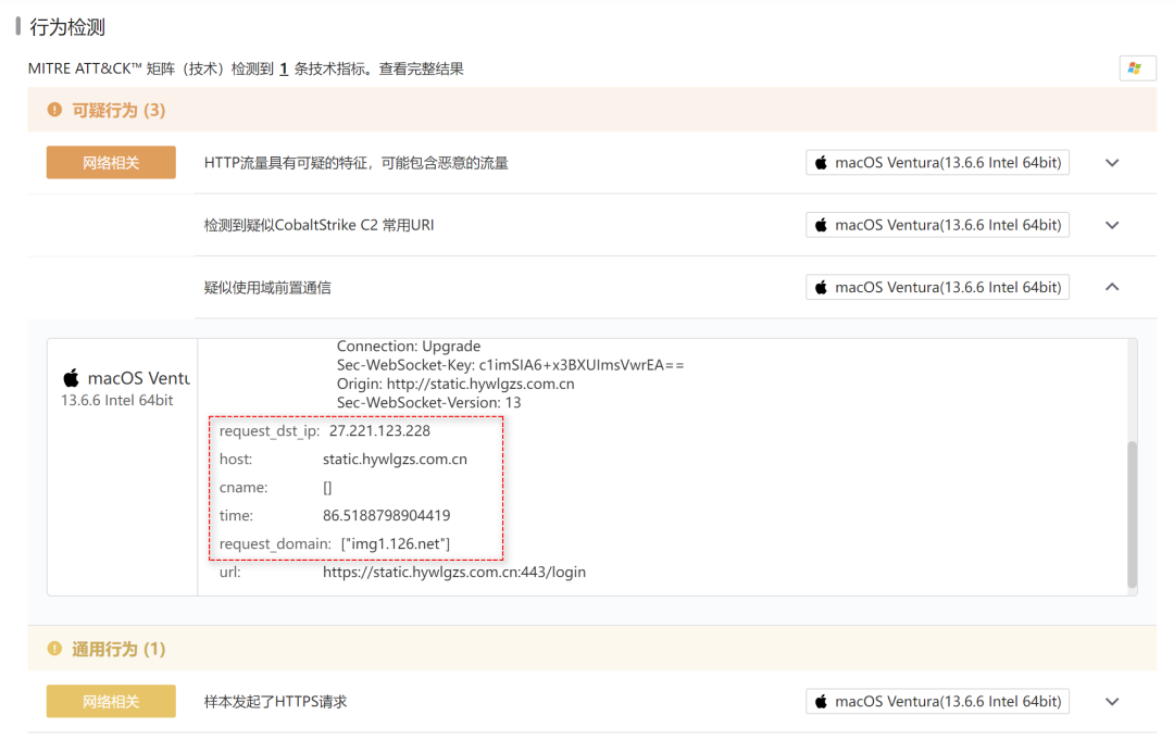 继续进行动态分析,发现该样本使用了基于HTTPS协议的域前置技术进行网络通信。基于沙箱的HTTPS解密功能,可以看到域前置通信中请求域名为img1.126.net,请求IP为27.221.123.228,请求Host为static.hywlgzs.com.cn。