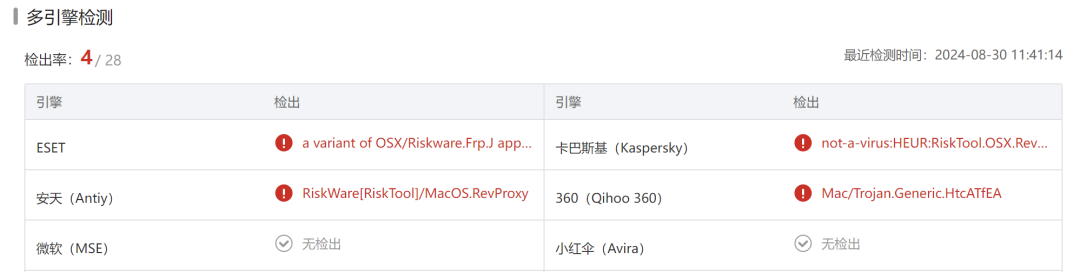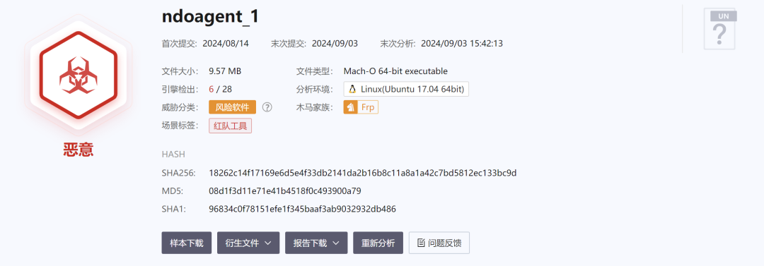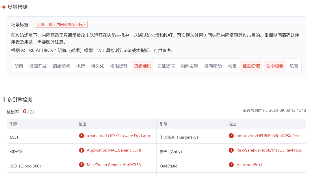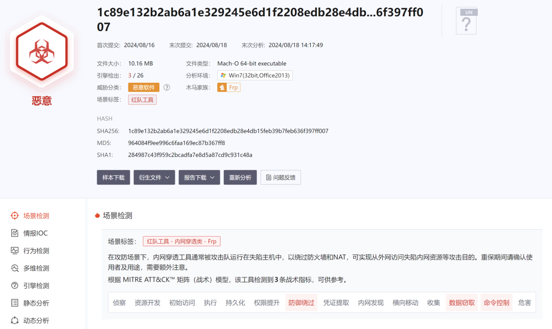分析完成后,可以看到该样本被沙箱检出恶意,多引擎检测结果显示样本包含Frp工具。