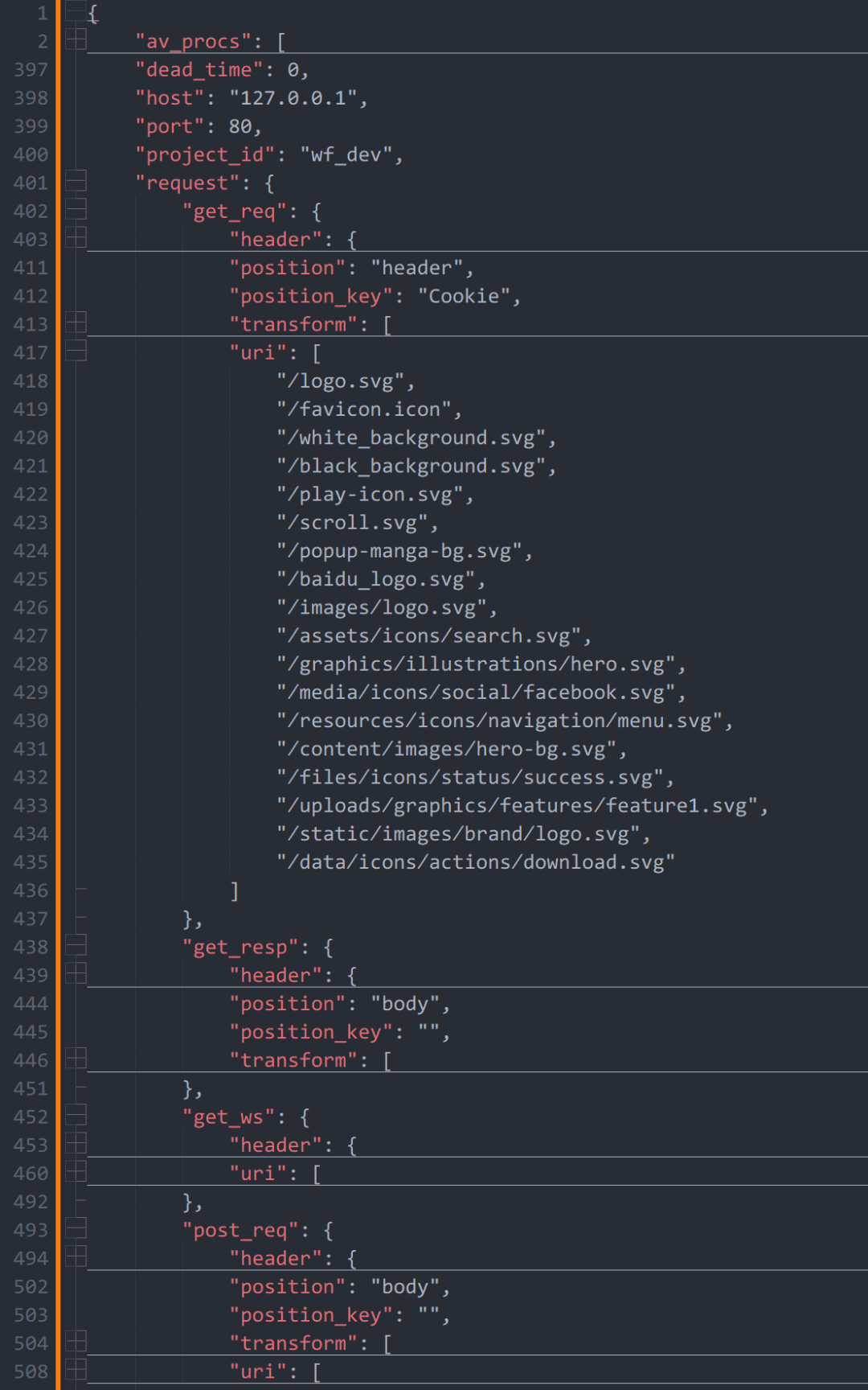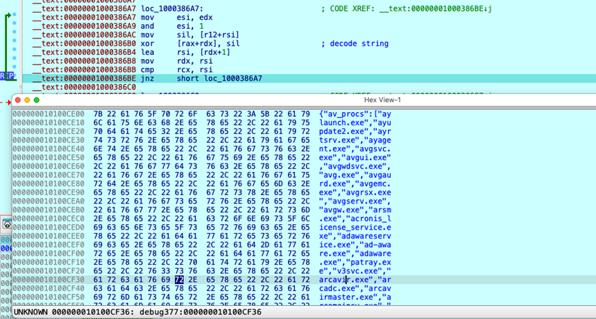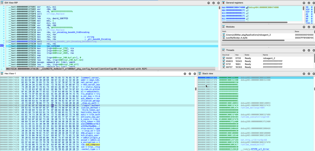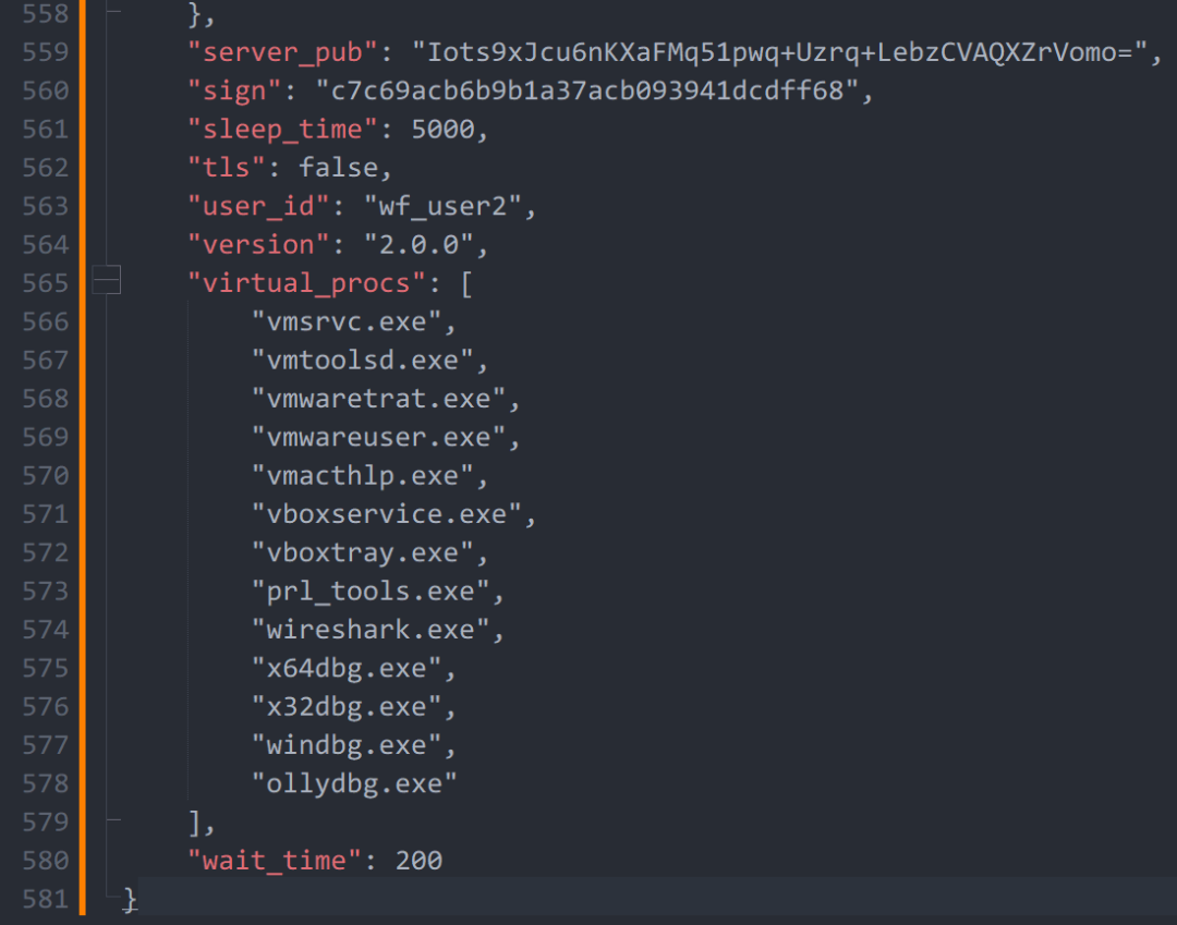 ndoagent_3为核心远控程序,该文件使用Rust编写。该程序执行会内存解密一个JSON配置,其中包含网络请求、杀软、虚拟环境和分析调试工具进程等相关配置信息,不过其进程为Windows相关,猜测此木马可能复用了Windows版本代码。